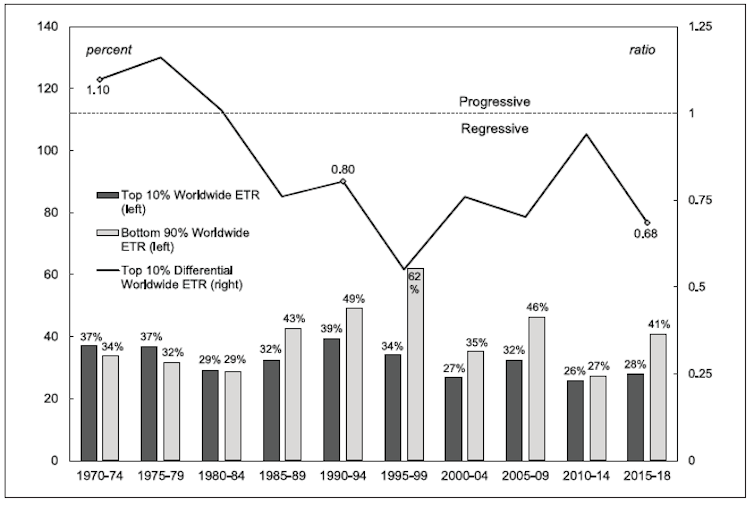 Giant advantages. The worldwide tax system was progressive in the 1970s, with the largest corporations paying slightly higher rates than the smaller ones. By the mid-1980s the system had turned sharply regressive and has stayed so ever since. For 2015-18, smaller listed corporations were effectively paying a 41% rate on their profits, while larger corporations paid 28%. Bloomicon
