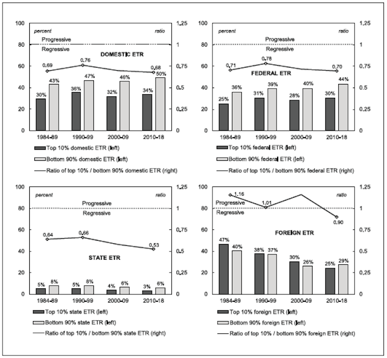 This is different to what American corporations pay to other countries, as shown in the graph labelled “foreign” in the bottom right-hand corner. This rate has fallen dramatically for larger and smaller corporations alike, fitting the conventional wisdom that tax competition has intensified with globalisation. Until as recently as the end of the 1990s, however, the foreign tax structure in the US was progressive, meaning that the largest corporations were paying more. This has now reversed, just like it did for domestic taxes several decades earlier.