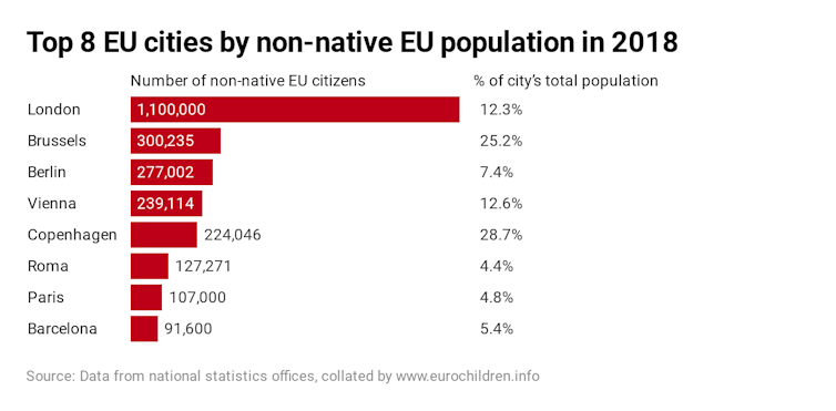 London is one of the capitals of the EU, home to over 1.1m non-British EU citizens, including a large number of families and children. This, according to my team’s ongoing analysis of data from across the EU, is by far the largest conglomerate of non-native EU citizens in the EU.