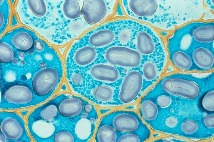 The structure of a cooked white bean under a microscope. Visible are the gelatinized starch grains (blue-violet), the protein aggregates (blue) and the fibrous walls (orange), which limit the digestion of starch by α-amylases, making sugars ‘slow’ and satiating. INRA Library, Author providedThree physiological effects